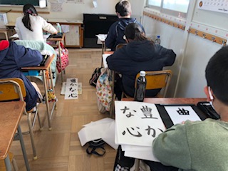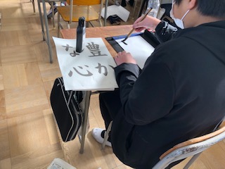 縦長の半紙に向かって静かに毛筆で字を書いています。