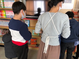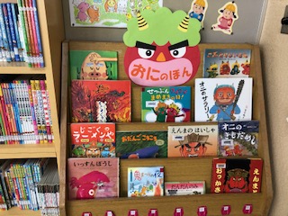 学校図書館で本に親しんでいます。展示はお正月の本から節分関係の鬼の本へとかわっています。