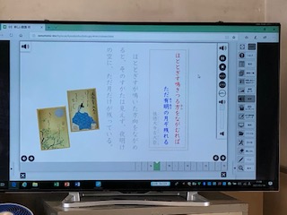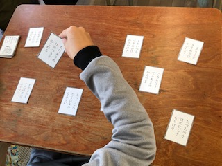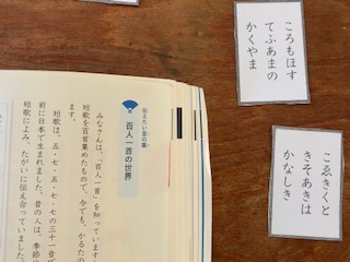 百人一首を学習しています。先生が上の句を読んで子どもたちは下の句を取っていきます。