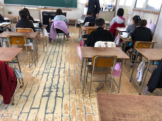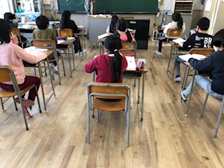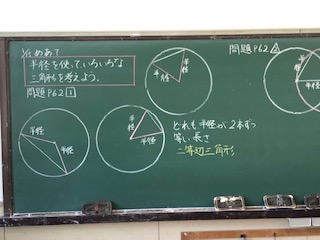円の半径を使っていろいろな三角形について考えていきました。クラスを二つに分けて少人数での授業を行っています。