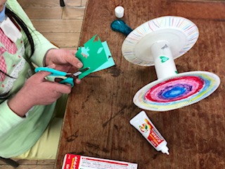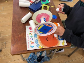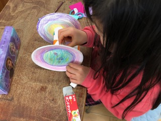 「かみざらコロコロ」の学習を進めています。絵を描いたり、色を塗ったりした紙皿に軸を取り付けてコロコロと動くようにしています。(写真は2月1日)