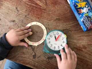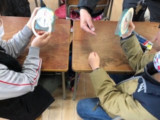 1年生では時計の読み方も学習します。分の数字が刻まれた補助教具も使っています。