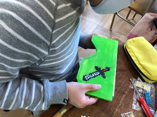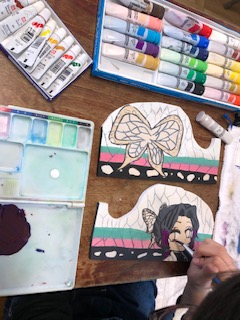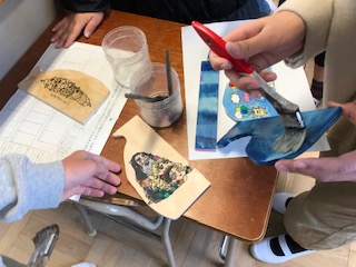 テープカッターを作っています。板に絵を描いて、その上にニスを塗り、組み立てていきます。