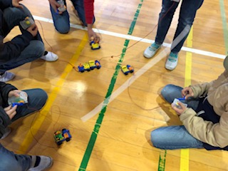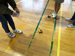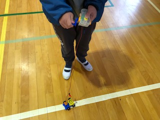 手回しで発電してモーターを動かします。今日は広い講堂で動かしました。