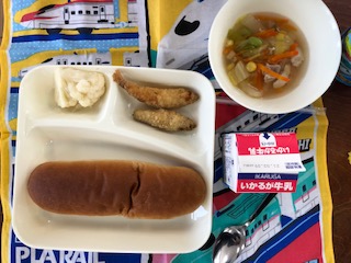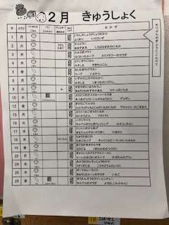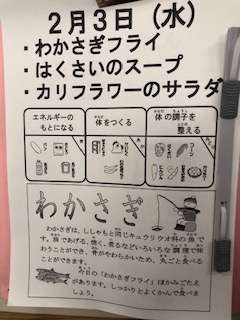 今日の給食には、わかさぎのフライがでました。教室には2月の献立表が掲示されています。
