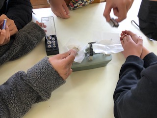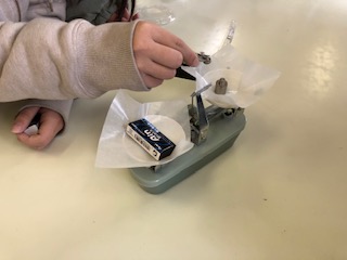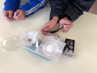 てんびんの学習をしています。消しゴムの重さ(質量)をはかったり、5gの食塩をはかりとったりしました。分銅を手ではなく、ピンセットを使って置いています。