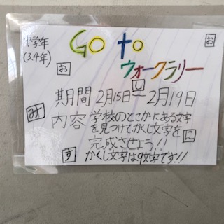 代表委員会が中心に進めている「Go toウォークラリー亅は、今週は3年生と4年生が行います。(子どもたちがポイントで混み合ってしまうのを避けるため、先週は1年生と2年生、来週は5年生と6年生のように分けています。)