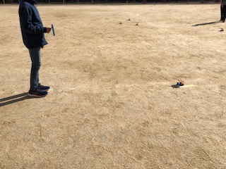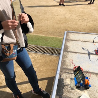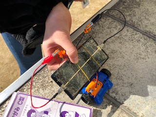 光電池に鏡で日光を当ててモーターカーの速さの違いを確かめています。