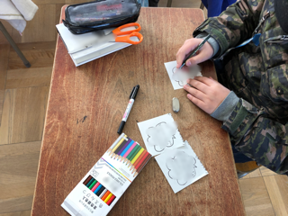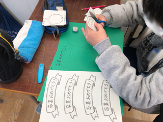 書いているのは、6年生へのメッセージカードです。卒業をお祝いすることばを心を込めて書いています。