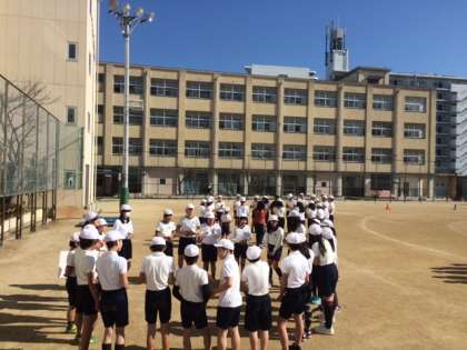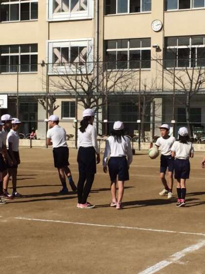 瑞光中学校で一緒になる、小松小学校と大隅東小学校の6年生が、大隅東小学校の運動場に集合しました。進学を前にして、3校で一足早い交流会を行いました。開会式の後、3校混合のグループ分けをして、自己紹介。そして、いよいよドッジボールと大なわの開始です。