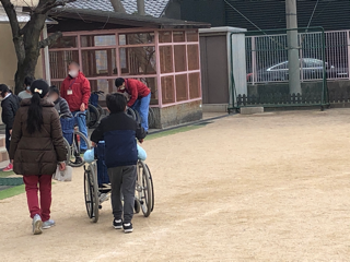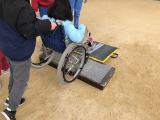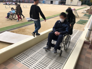 運動場でも車いす体験をしました。ここでは介助者(車いすを押します)の体験も行いました。担任も乗って体験しています。スロープの降り方、段差のあるところの登り降りも安全にできていました。