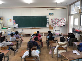 児童朝会は運動場に集まることを避けて放送で行っています。教室でしっかりと放送を聞いています。