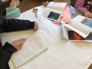 タブレットなどで調べたことをグループごとに大きな紙にまとめています。
