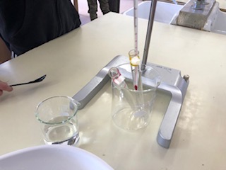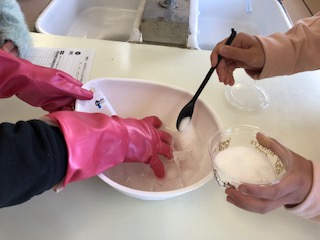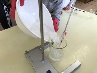 水を入れた試験管をビーカーに置き、温度計も入れておきます。食塩を氷に混ぜてビーカーに入れていきます。