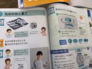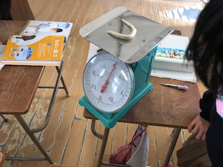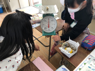 物の形を変えると重さはどうなるかを実際に粘土の形を変えて計って比べています。(写真は3月1日)