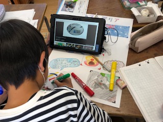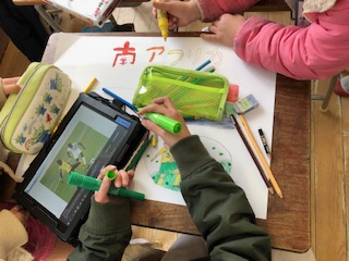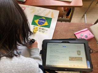 3年生も世界の国についてタブレットを使ってグループで調べています。
