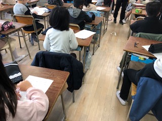 地区ごとに集まって4月からの集団登校の班編成をしました。新しい班長や副班長を決めて、集合場所や時間などを確認しました。また、担当教員から安全な集団登校をするために大事なことについての話もありました。