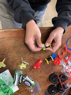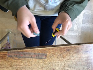 電磁石のエナメル線の両端を紙やすりで磨いています。