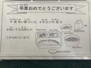 卒業をお祝いする献立で6年生の卒業を一足早く給食でお祝いしました。(この献立は1年生から6年生までの全児童が対象です)