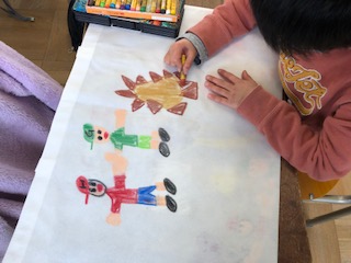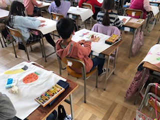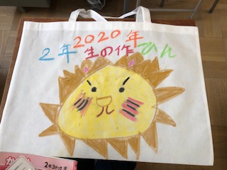 2年生の1年間に作った作品を入れる袋に絵を描いています。