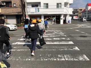 6年生が公園に行って遊んでみんなと楽しい思い出を作ります。遊ぶ用具も持って元気に出発しました。