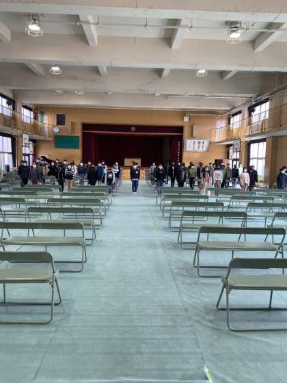 6年生は卒業式の練習に取り組んでいます。この写真はよびかけのところです。保護者席は写真では空席となっている長椅子となります。この席は児童の人数分を用意します。