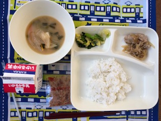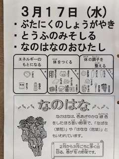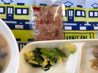 今日の給食には、菜の花がでました。かつお節もつきました。