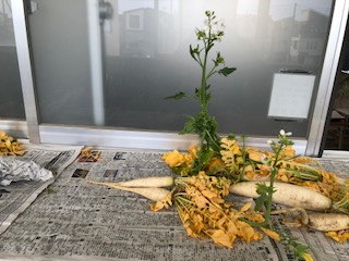 掘り起こしただいこんの生命力は強くて花も咲いています。
