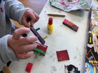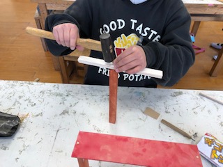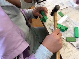 のこぎりで切った木を金づちを使ってくぎで組み立てています。