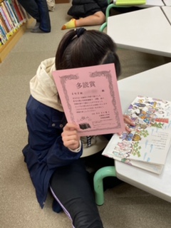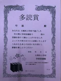 6年生が学校図書館を利用するのも今日が最後となります。学校図書館補助員の方から6年生に多読賞が贈られました。ここには、入学してから卒業するまでに借りた図書の冊数と初めて学校図書館では借りた図書の名前が書かれています。