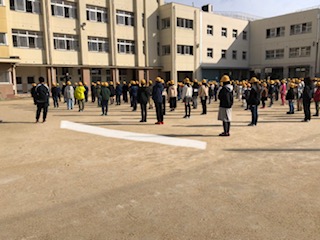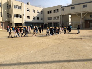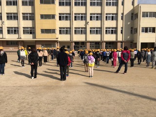 運動場で間隔を開けて児童朝会をしました。6年生の列には立っている姿はなく、卒業したことが実感となって伝わってきます。(白い線が6年生の列)