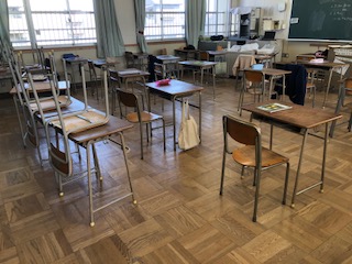 新しいクラスの人数に合わせて机やいすを移動しました。5年生ががんばって運んでいます。