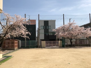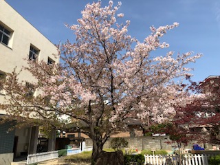 校庭の桜が満開となっていて、花びらが風に舞っています。