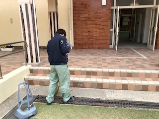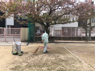 明日の入学式の準備をしています。運動場や廊下などの桜の花びらをはいています。