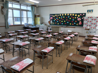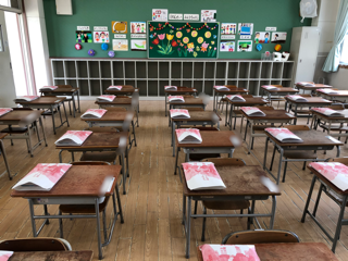 児童の氏名が書かれたシールが貼られた机の上には、文部科学省の封筒に入った教科書が置かれています。