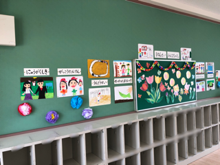 教室の様子です。前の黒板には一人一人の名前が書かれたものがはられ、後ろのボードには2年生が描いた絵がはられています。