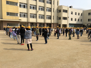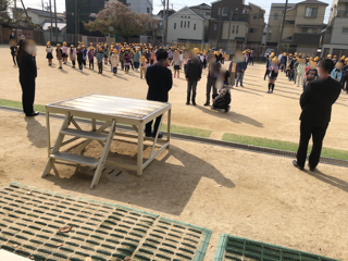 運動場に間隔を開けて並びました。はじめに着任式を行い、続けて始業式を行いました。この後、組分けのある学年の組分けをしました。