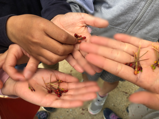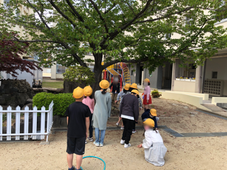 桜の木も観察しました。その下にはたくさんのさくらんぼが!大喜びで手のひらにのせています。この他にもたくさんの生き物を見つけることができました。(顔や指にモザイク処理をしています)