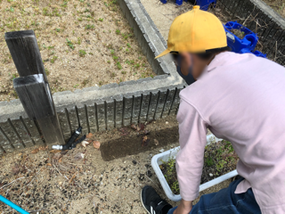 春の生き物を探しに学習園にきました。プランターの下に虫発見!興味深々ですね。