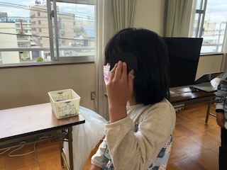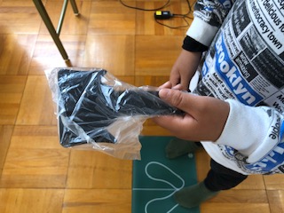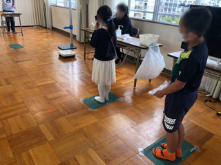 多目的室で視力検査をしています。目に当てる板は、消毒されて袋に入れられたものを使用しています。