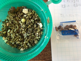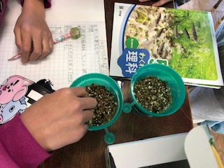 発芽の実験をしています。インゲン豆の種を植えてどのような条件の時に発芽するかを調べています。箱に入れていたケースを取り出してみると芽が出ていました。