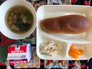 今日の給食にはグラタンがでました。みかんの缶詰もつきました。