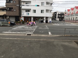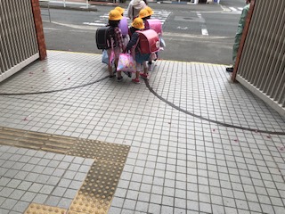 給食のあと、教職員の引率のもと1年生が方面ごとに下校していきます。このような下校は本日までとなっています。