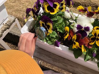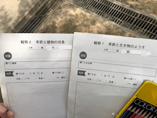 観察カードを使って学習しています。今日は学習園で植物などの生き物を虫めがねでも詳しく観察しました。