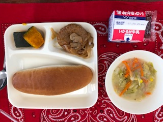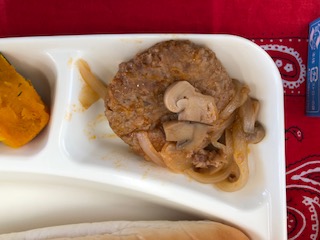 今日の給食には、子どもたちが大好きなハンバーグ(煮込み)がでました。