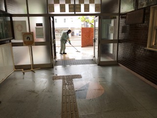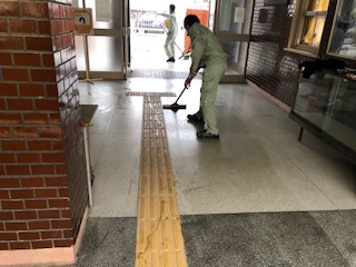 今日は雨のため、玄関がすべりやすくなるので管理作業員が水気を取っています。