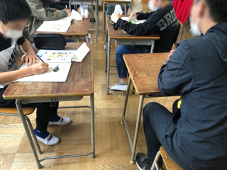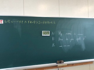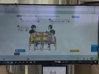 今日は、名前のつづりを英語でたずねる言い方について学習しました。担任は時にはグループの席に座ってヒントを出します。
