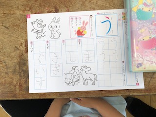 1年生は、登校した時間に学習を進めていて、ひらがなも順に学んでいます。今日は、「う」を習いました。
