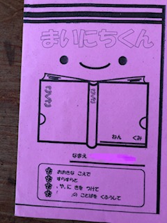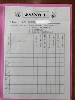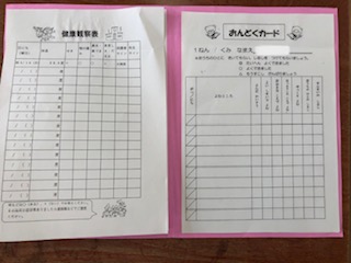 ご家庭で毎日記入していただく1年生のカードです。「まいにちくん」と名づけられ、健康観察表と音読カードが中に貼られています。