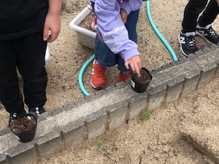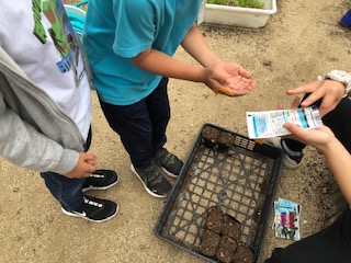 3年生が、ひまわり、マリーゴールド、ホウセンカなどの種を一人ずつポットにまきました。夏に咲く花が楽しみです。